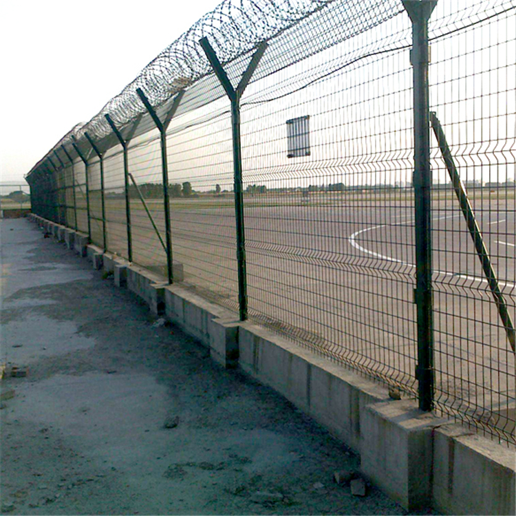 如果有坐過飛機的朋友可以看到機場外圍有一層綠色金屬絲編織或焊接的圍網,這就是我們要說的機場圍界網又稱作機場隔離柵“Y型安全防御護網”,是由V型支架立柱,加強型焊接片網,安全防盜連接件和熱鍍鋅刀片刺網組成強度和安全防御性級別很高。近年來,被廣泛應用在機場,軍事基地等特殊場所。